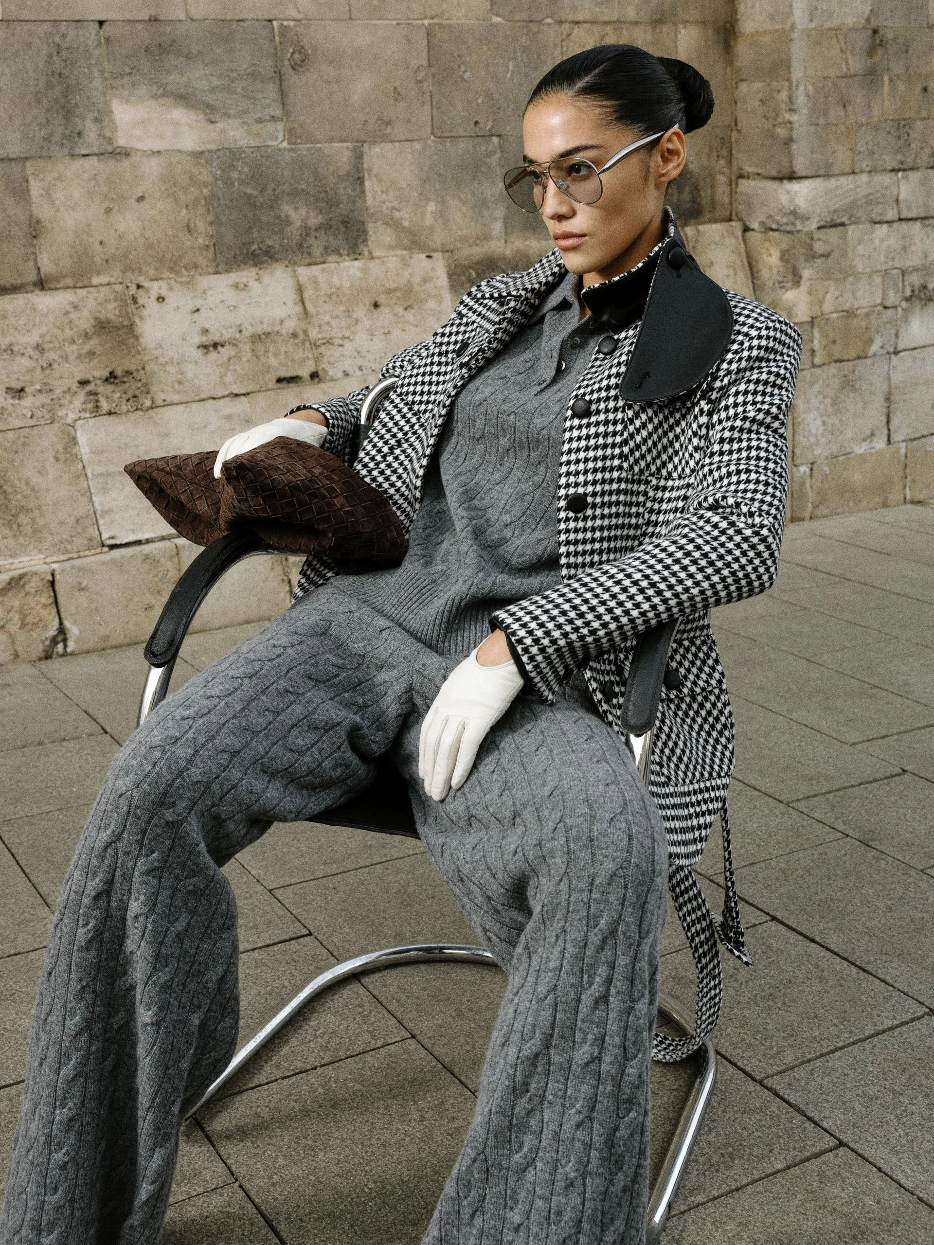 Узкие брюки в полоску. Модель средней посадки с замочками по низу брюк.