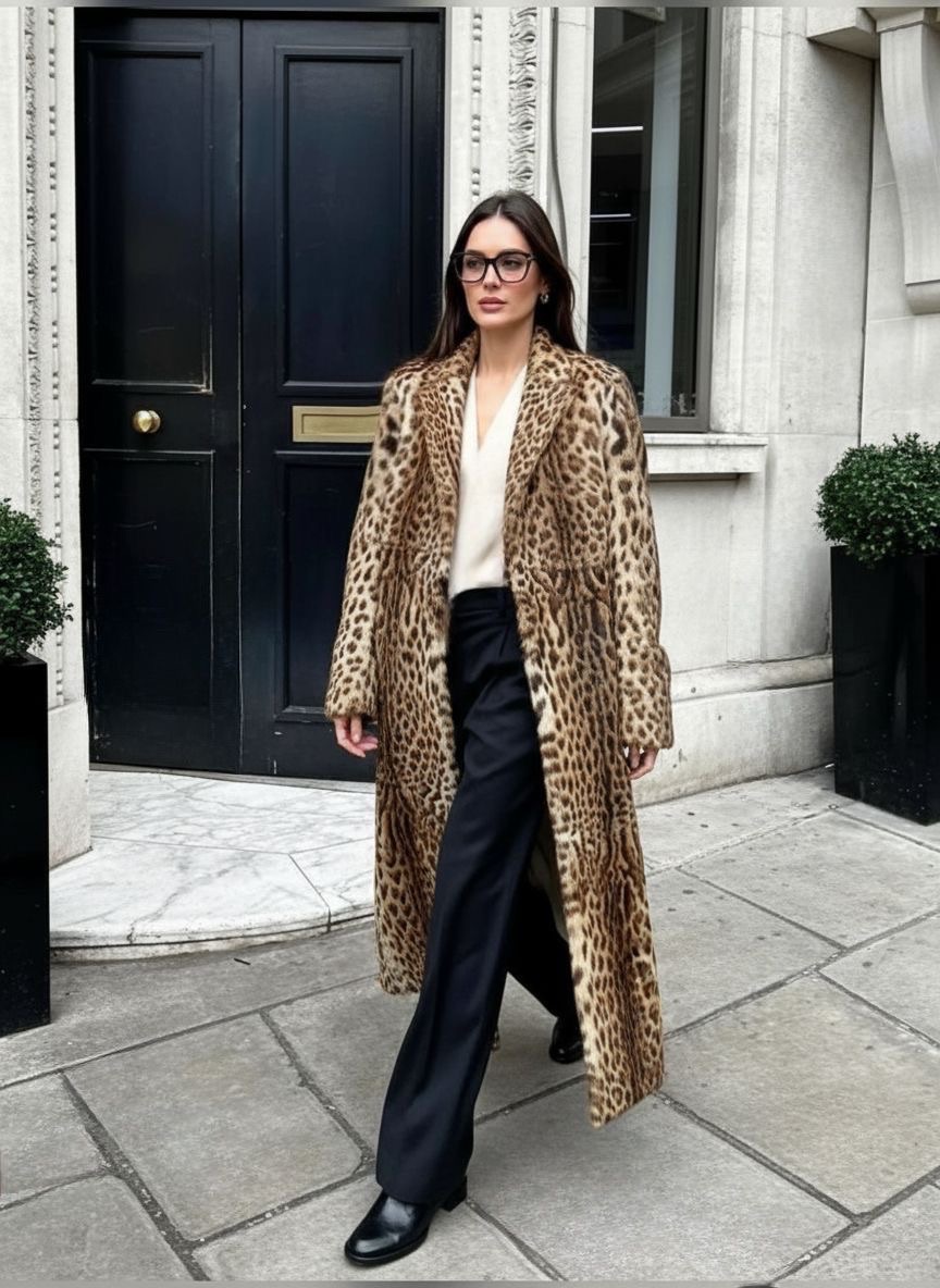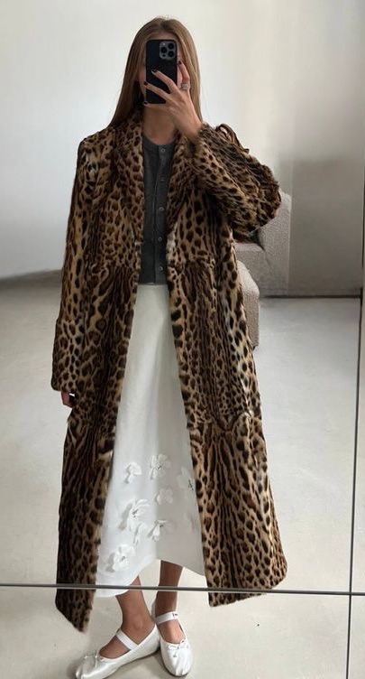 Роскошное пальто из натурального меха оцелота имеет английский воротник. Застегивается на фурнитуру в виде небольших крючков и подходит до -20°.
